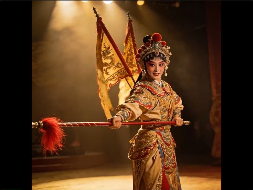 注:生成视频中角色的唱腔、妆造及身段与真实剧种规范仍有明显差距,台词也非传统戏文,仅作为 AI 技术对戏曲美学的一次初步探索。