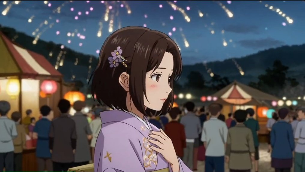 T2V prompt:夏日花火大会动漫风格,烟花绽放提供柔和轮廓光。镜头从全景烟花推至人群中穿和服的男女主,特写镜头捕捉女生做告白前的心理准备,男生羞涩开口「実は...」,女生抢先一步告白「大好きです」,两人互表心意后亲密相拥。烟花声、人群环境声与日语对白融合,营造浪漫且连贯的叙事氛围。