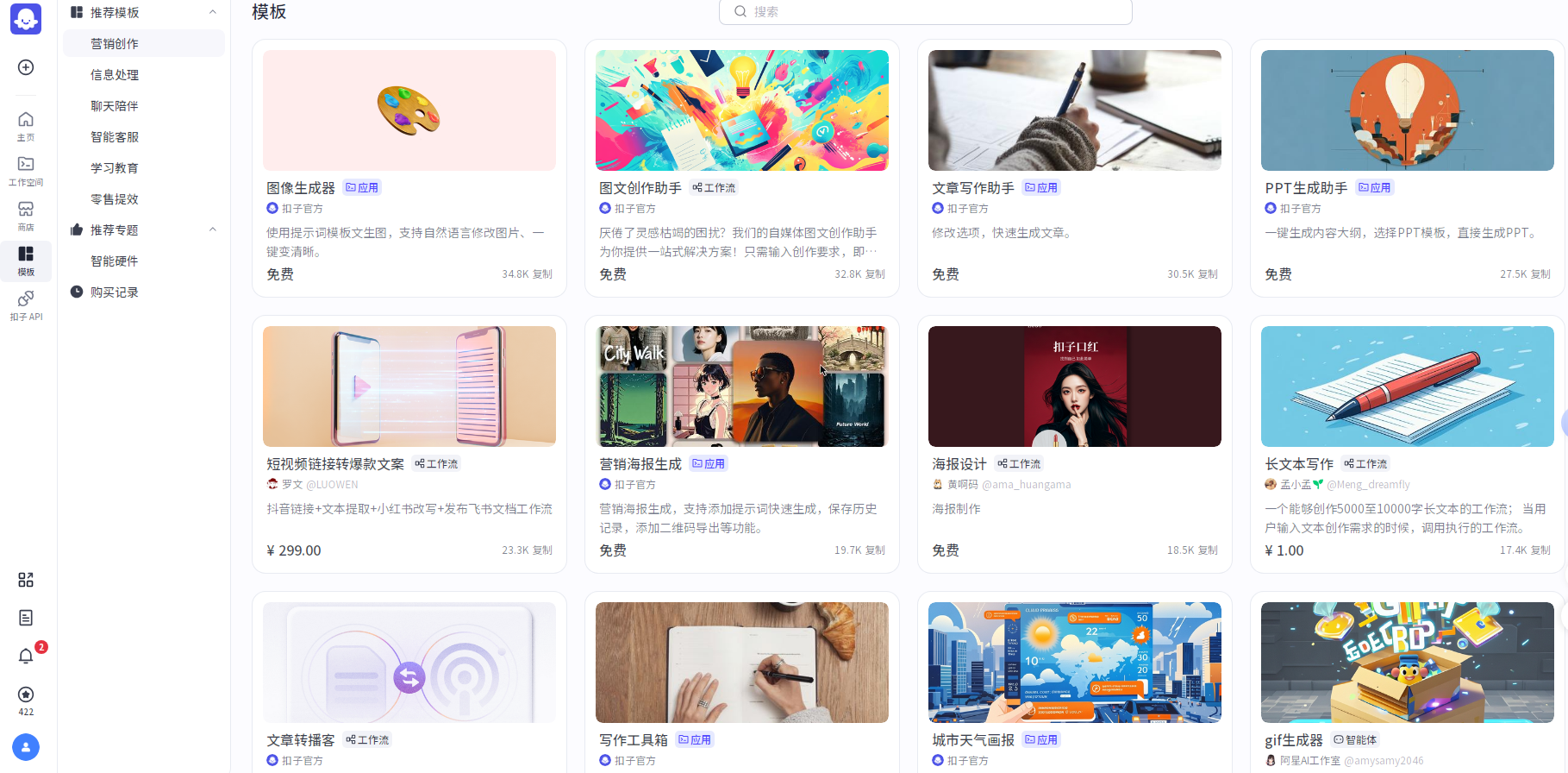 第一步:在主页面推荐模板当中,点击营销创作,找到图像生成器板块,点击进入应用。