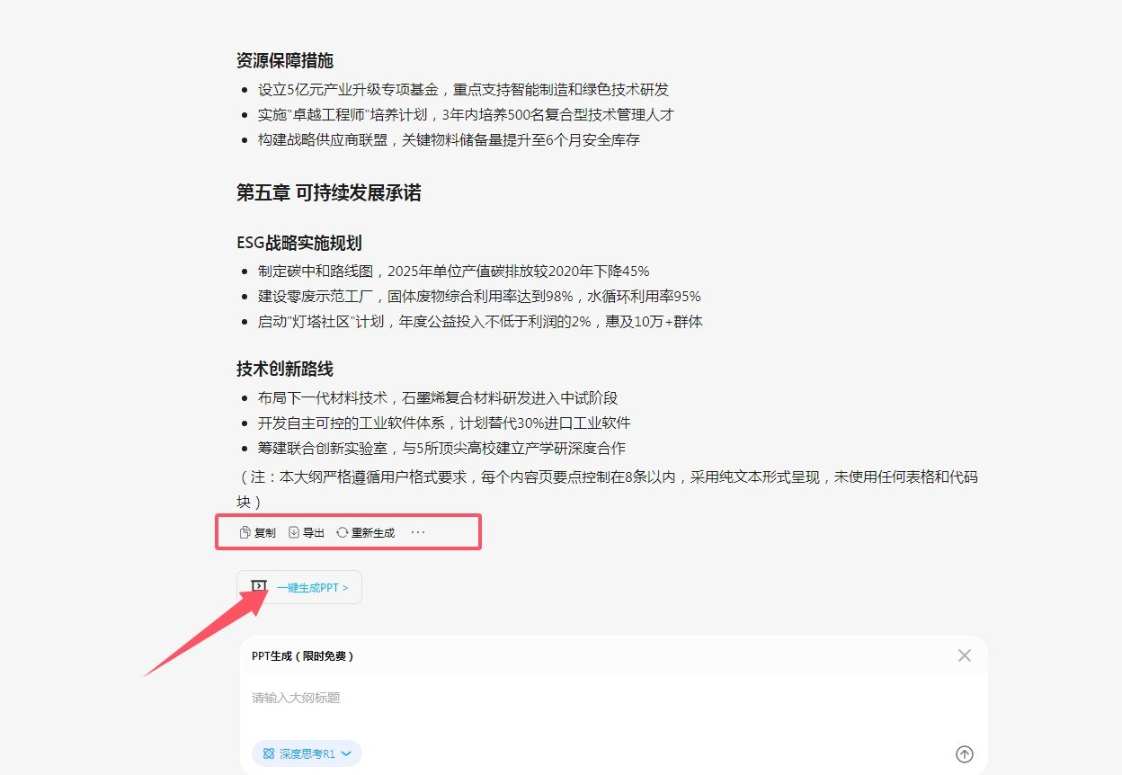 生成的大纲下方会呈现出复制、导出以及重新生成的按钮。