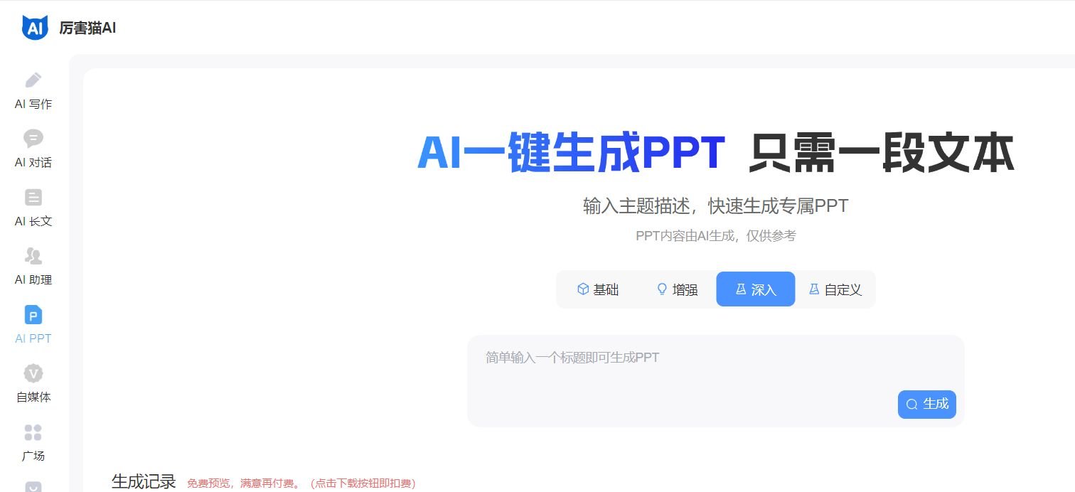 工作的时候我们都想效率高一点,想要做ppt的时候就可以选择厉害猫AI PPT,在操作的时候比较简答,就算是刚刚使用软件的人也可以轻松的操作,但是素材可能并没有想象的那么多,但也可以选择自定义的方式操作,所以在短时间内就能生成自己想要的内容,在后期还可以去修改,对马上想要生成ppt的朋友来说这款值得推荐。