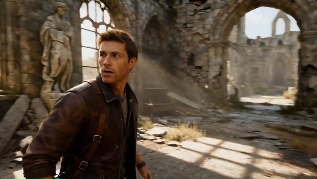 I2V prompt:3D 游戏 CG 视频,皮夹克男人在废弃教堂遗址中行动,他警觉停下,确认安全后冲刺,最后在拱门边缘急停观察。画面采用左侧高窗逆光拍摄,呈现暖色调黄褐色。音频精准叠加脚步声、心跳声和猫头鹰叫声,配合紧张背景乐营造悬疑氛围。