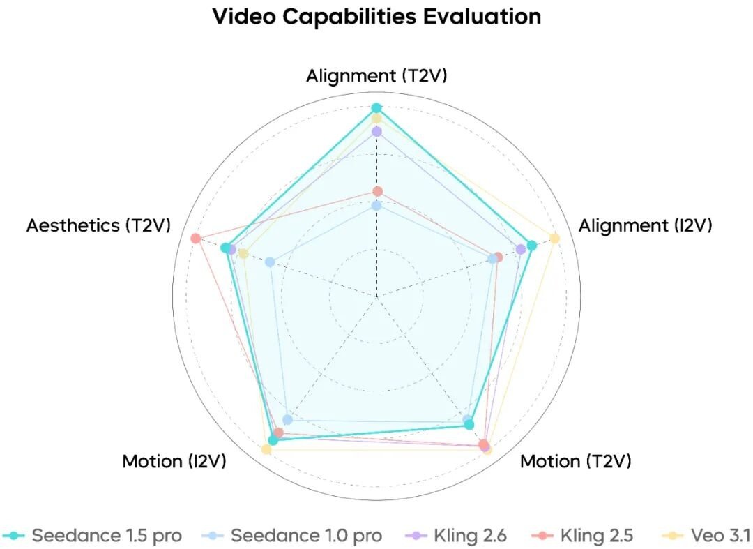 在综合评测中,Seedance 1.5 pro 取得领先的结果,各项关键能力处于业界前列。目前,Seedance 1.5 pro 已上线即梦AI和豆包,欢迎使用反馈。