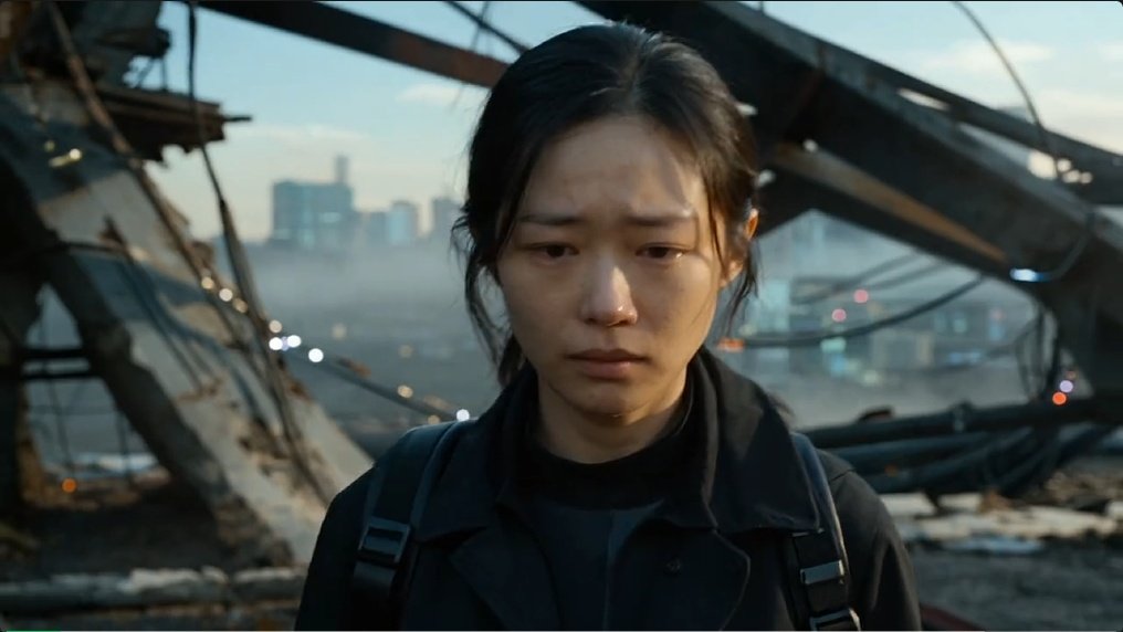 T2V prompt:赛博朋克废墟风格,冷暖光影交替。镜头手持跟随年轻东亚女性,特写捕捉她从眼眶含泪的压抑悲伤,随着朝阳金光洒在脸上,神情转为温柔坚定的微表情变化。人物皮肤具备真实胶片质感,浅景深背景虚化。