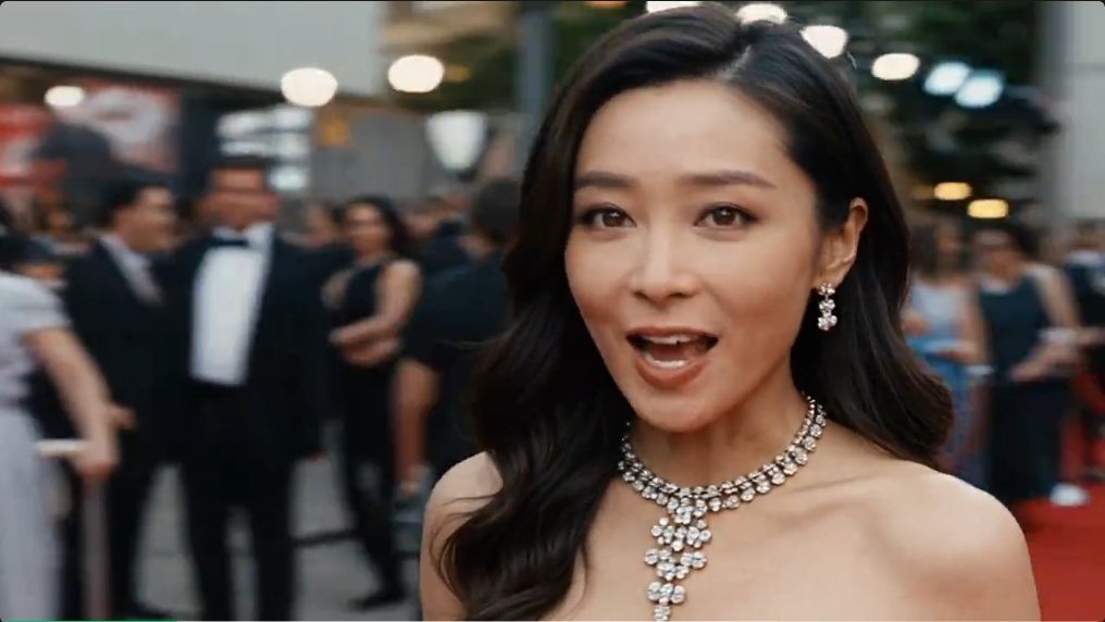 T2V prompt:身穿晚礼服的亚洲时尚博主在红毯出镜,兴奋地说道:“空气里都是香水和野心的味道!今晚的红毯简直是时装编年史的现场,快跟我来捕捉那个高光时刻!”