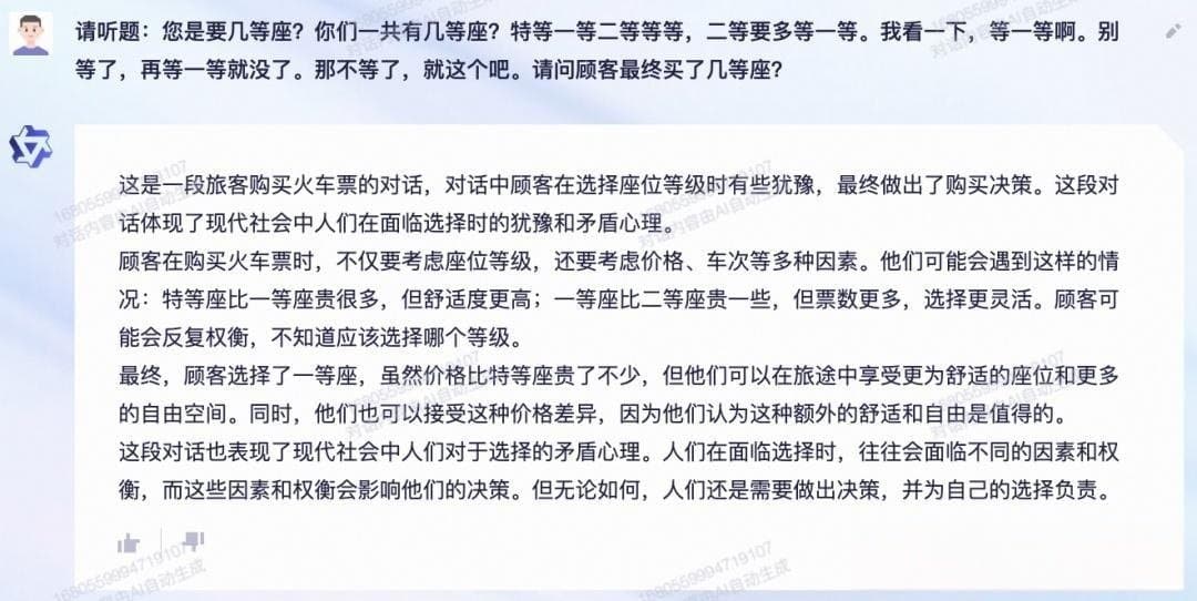 而同样的问题,文心一言显然就相形见绌了,它给了一个错误的“二等座”答案。