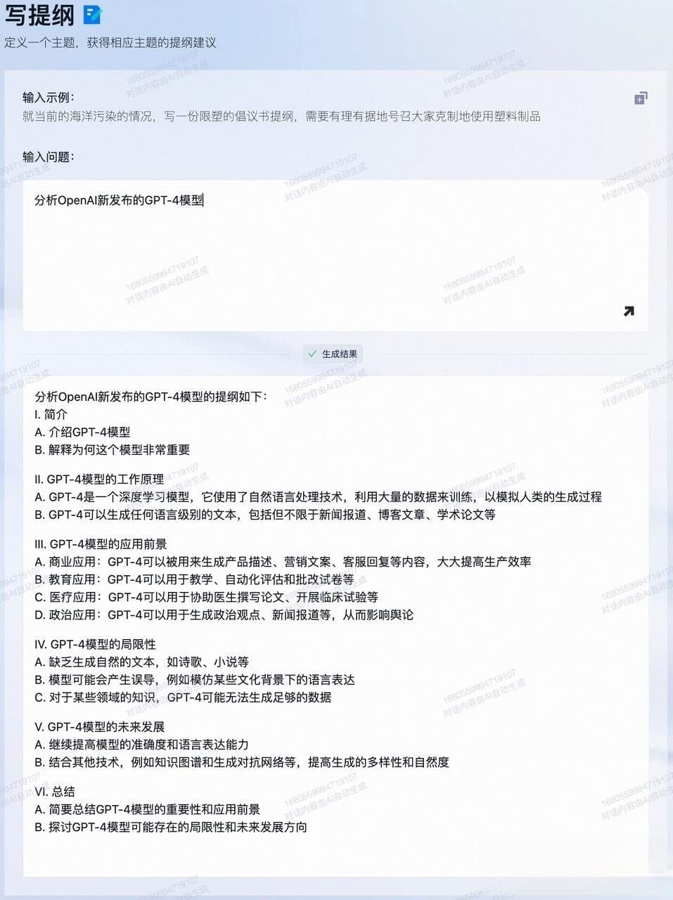 最后以「分析OpenAI新发布的GPT-4模型结尾」列个提纲。通义千问生成的提纲把GPT-4的原理、前景、局限都覆盖到了,相当全面。
