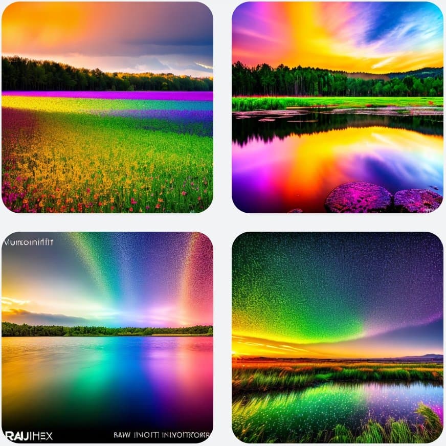 最后,我们直接“开大”:选择叠加风格为“摄影”,光线为“晨光”、“边缘光”以及“背景照明”,艺术家风格为“梵高”,采样步数从 20 提高到 30,并改为写实画风,几幅美轮美奂的彩虹图片跃然纸上: