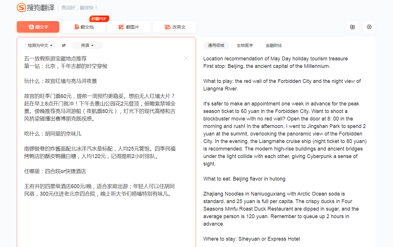 搜狗翻译支持免费使用,文字翻译完全免费,无需付费即可使用。文档翻译每月赠送50页免费体验额度,免费体验,当月有效每月1号刷新。当免费额度使用完毕pdf、 word 、Excel 、txt 、csv。Ppt每页0.08元,Pdf文件无法导出word时每页0.08元。