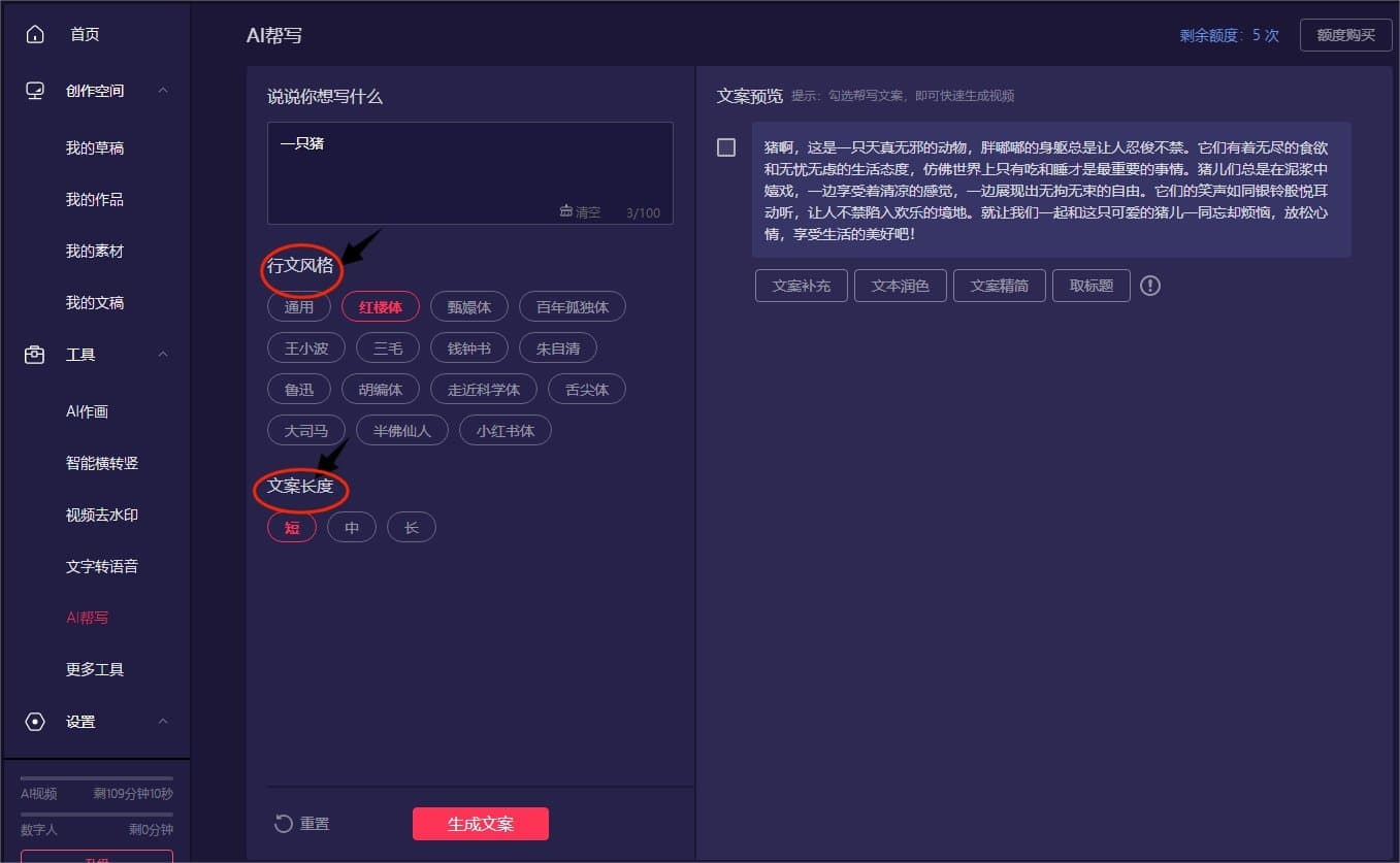 进入AI帮写页面后,输入描述文案的关键词(即你想要的文案具体想要包含什么,字数在100以内),选择合适的风格以及文案长度,点击生成文案。