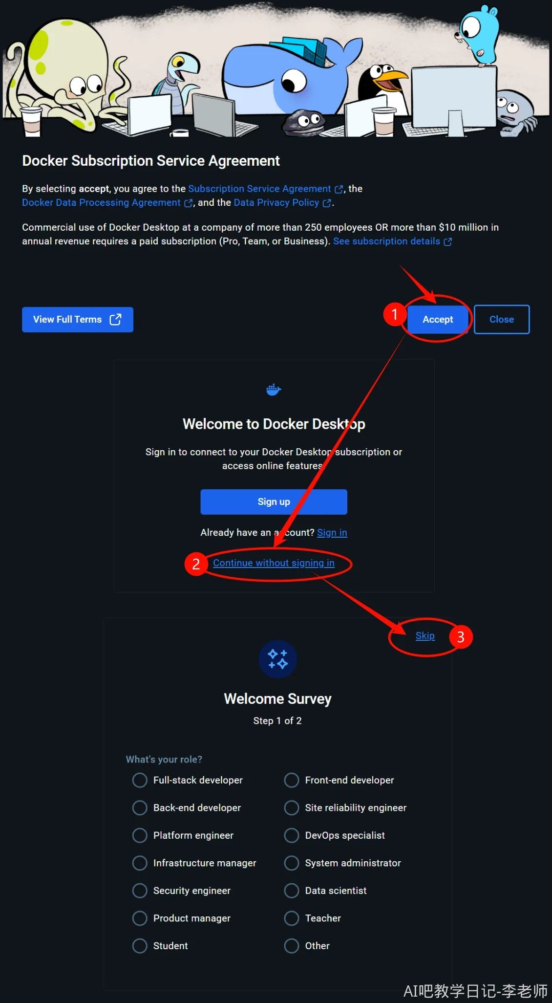 重启计算机后,Docker 的安装程序会继续进行,如果没有继续,你可以手动运行桌面上的图标启动 docker。