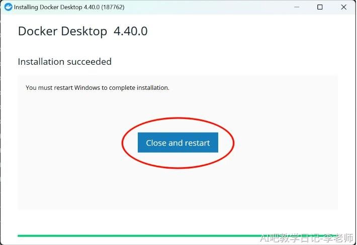 安装完成,注意,由于新装WSL 2是系统级更改,点击下图中的Close and restart会立即重启计算机,请做好保存工作,以免造成数据丢失。